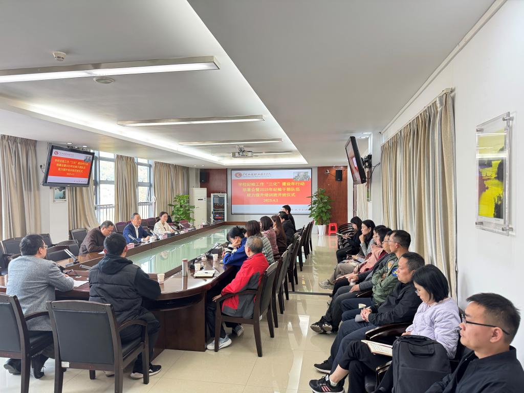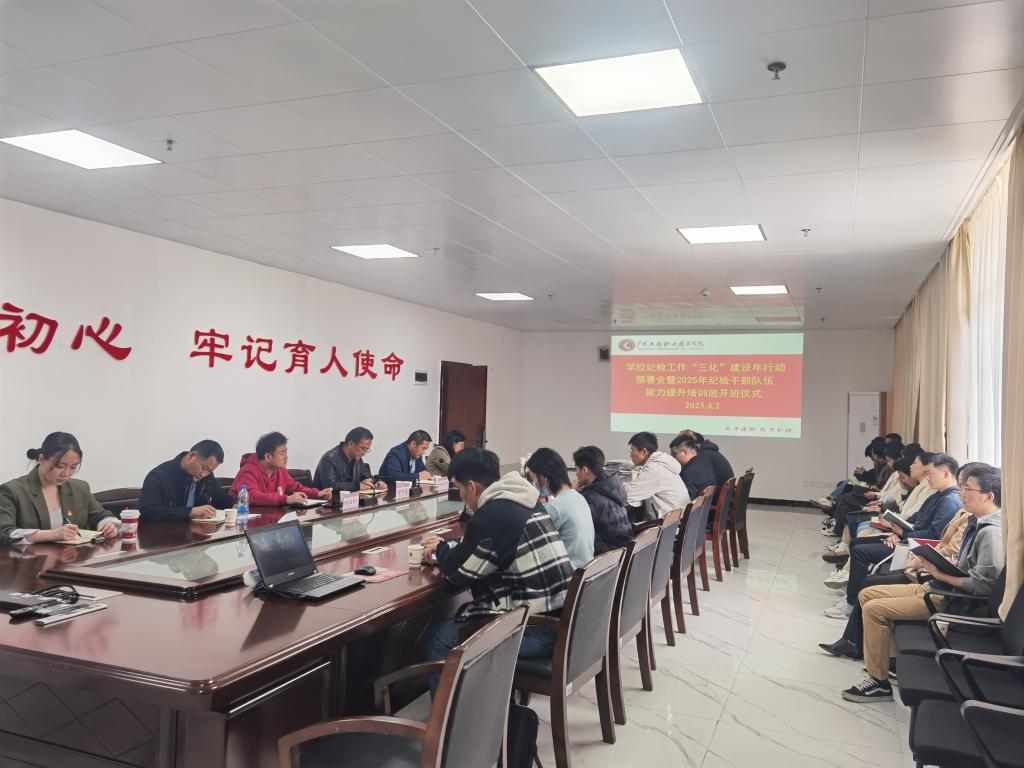 2025年4月2日下午,学校在广州校区办公楼615室和省职教城校区办公楼411室召开纪检工作“三化”建设年行动部署会暨2025年纪检干部队伍能力提升班开班仪式。学校党委副书记、纪委书记徐振昌同志,学校纪委委员、各级党组织纪检委员、特约监督员参加会议。会议由学校纪委副书记、纪检室主任廖玮同志主持。