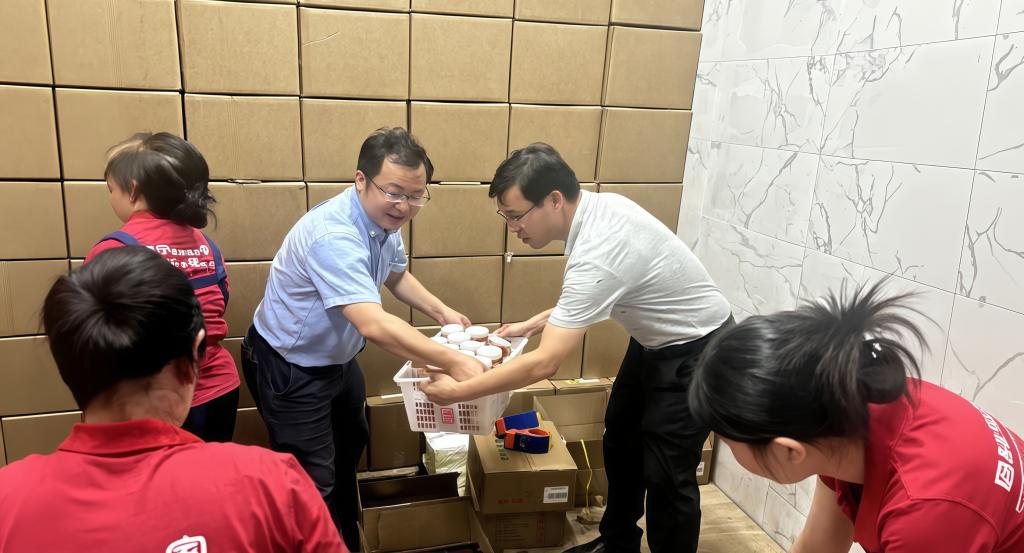 活动现场,我校派驻地方干部、省驻镇帮扶工作队与工作人员一起验货、理货、装货,争取赶在“双节”前将地方农特产品发到每名教职员工手上。