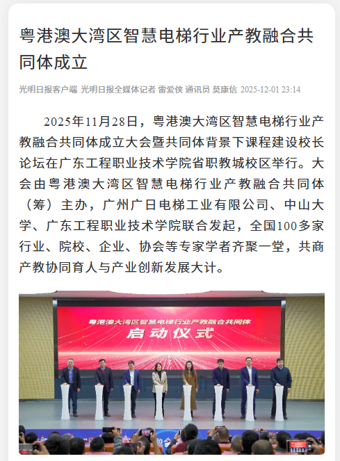 2025年11月28日,粤港澳大湾区智慧电梯行业产教融合共同体成立大会暨共同体背景下课程建设校长论坛在广东工程职业技术学院省职教城校区举行。大会由粤港澳大湾区智慧电梯行业产教融合共同体(筹)主办,广州广日电梯工业有限公司、中山大学、广东工程职业技术学院联合发起,全国100多家行业、院校、企业、协会等专家学者齐聚一堂,共商产教协同育人与产业创新发展大计。