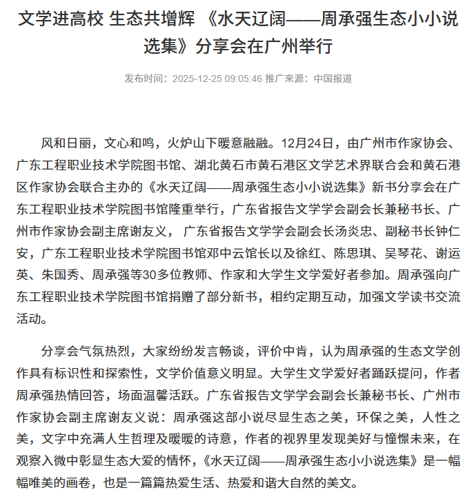 广东省报告文学学会副秘书长钟仁安说,周承强用笔描绘美丽生态图卷,穿行于新时代火热生活,人与自然共情的精神吟颂,赋予了作品更多家国情怀,以及人与自然和谐共生的崇高理念,是用文字丈量生态的行动书,展示了一种生态文学新视角,开卷有益,容易引起共鸣共情。该院现代通信技术专业24级大学生朱国秀感慨:与作者面对面交流,加深了对作品主题的深刻理解,提高了阅读效果,对我们理工科学生来说非常重要,希望今后多举办此类活动。