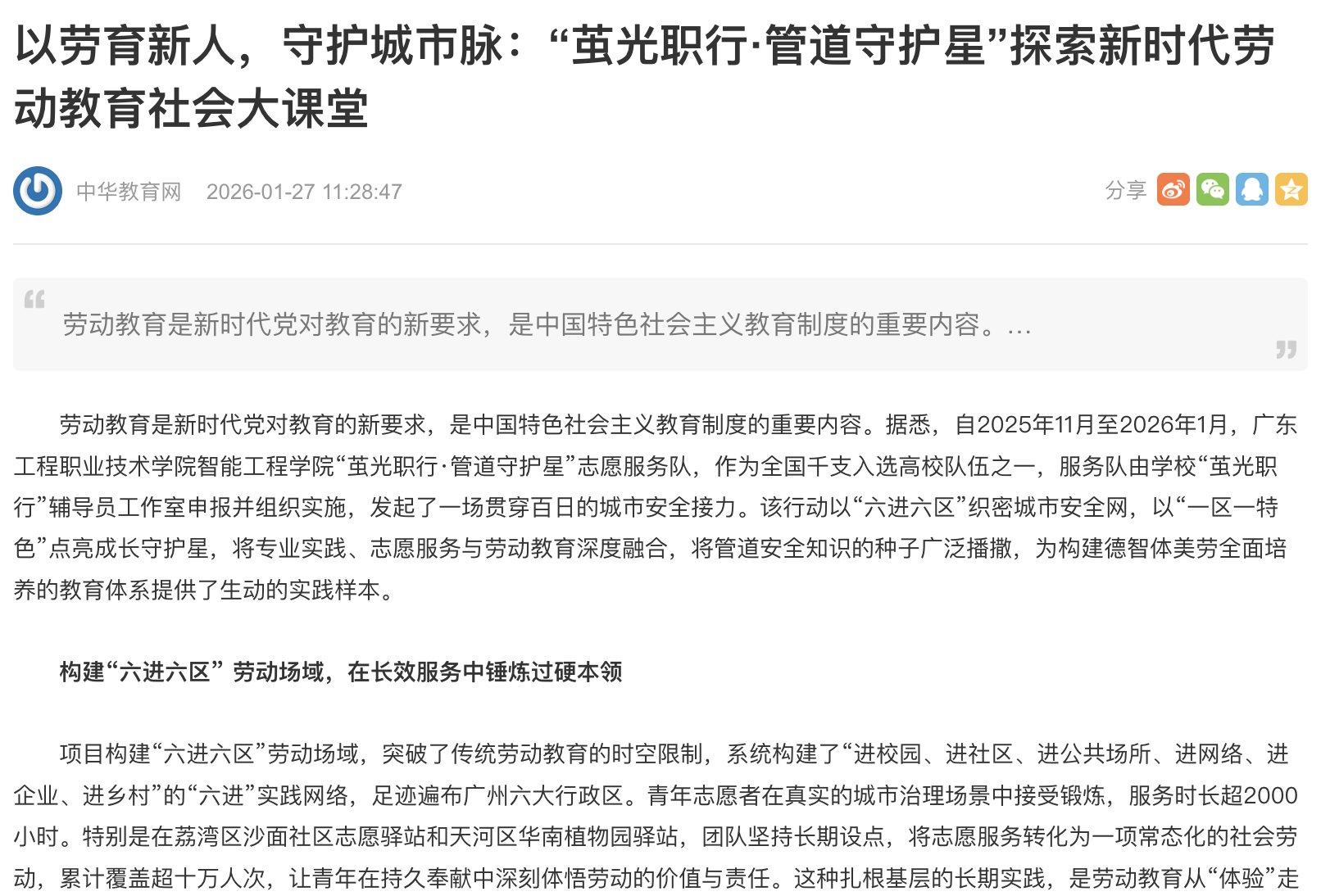 劳动教育是新时代党对教育的新要求,是中国特色社会主义教育制度的重要内容。据悉,自2025年11月至2026年1月,广东工程职业技术学院智能工程学院“茧光职行·管道守护星”志愿服务队,作为全国千支入选高校队伍之一,服务队由学校“茧光职行”辅导员工作室申报并组织实施,发起了一场贯穿百日的城市安全接力。该行动以“六进六区”织密城市安全网,以“一区一特色”点亮成长守护星,将专业实践、志愿服务与劳动教育深度融合,将管道安全知识的种子广泛播撒,为构建德智体美劳全面培养的教育体系提供了生动的实践样本。