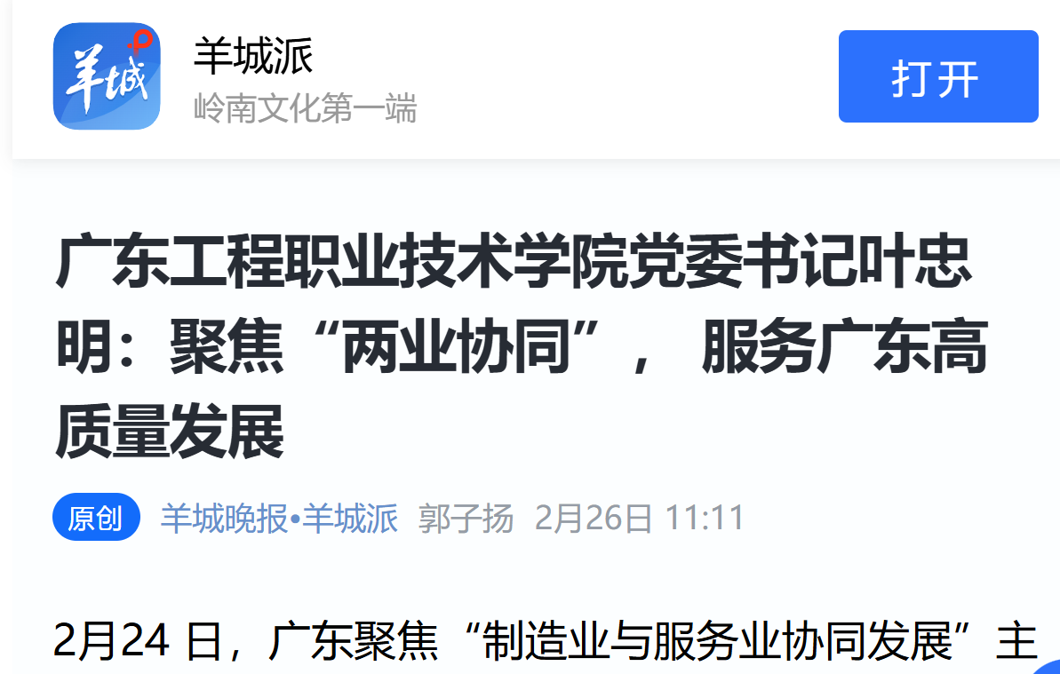 2月24 日,广东聚焦“制造业与服务业协同发展”主题,召开全省高质量发展大会。广东工程职业技术学院党委书记叶忠明表示,学校认真贯彻落实全省高质量发展大会精神,抢抓“制造业与服务业协同发展”的战略机遇,持续深化产教融合,推进教育链、人才链与产业链、创新链协同共进,在服务国家重大战略和区域经济社会发展中展现广东工程的担当与作为。