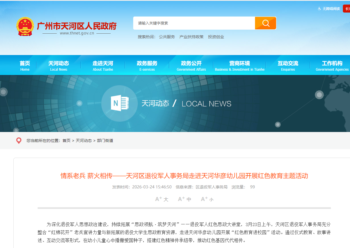 为深化退役军人思想政治建设,持续拓展“思政领航·筑梦天河”——退役军人红色思政大讲堂,3月23日上午,天河区退役军人事务局充分整合“红棉花开”老兵宣讲力量与新拓展的退役大学生思政教育资源,走进天河华彦幼儿园开展“红色教育进校园”活动。通过仪式教育、故事讲述、互动交流等形式,在幼小儿童心中播撒爱国种子,搭建红色精神传承纽带,推动红色基因代代相传。