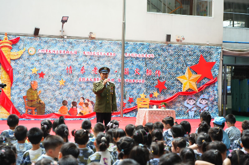 拥有三十八年军龄的天河区“红棉花开”老兵宣讲团强以文以亲身经历向孩子们讲述今日幸福生活的来之不易,勉励孩子们从小树立“不怕困难、勇于拼搏”的意志品质,立志成为民族复兴的“小小接班人”。“爷爷,在战场上您害怕吗?”“爷爷,怎样才能像您一样成为英雄?”孩子们踊跃提问,强爷爷一一耐心解答。“孩子们,战场上当然也会害怕,但如果再回到那段烽火岁月,我依然会毫不犹豫地选择穿上军装!”瞬间点燃了孩子们对英雄的崇敬之情,让红色精神在童言童语中实现跨越代际的对话与传承。