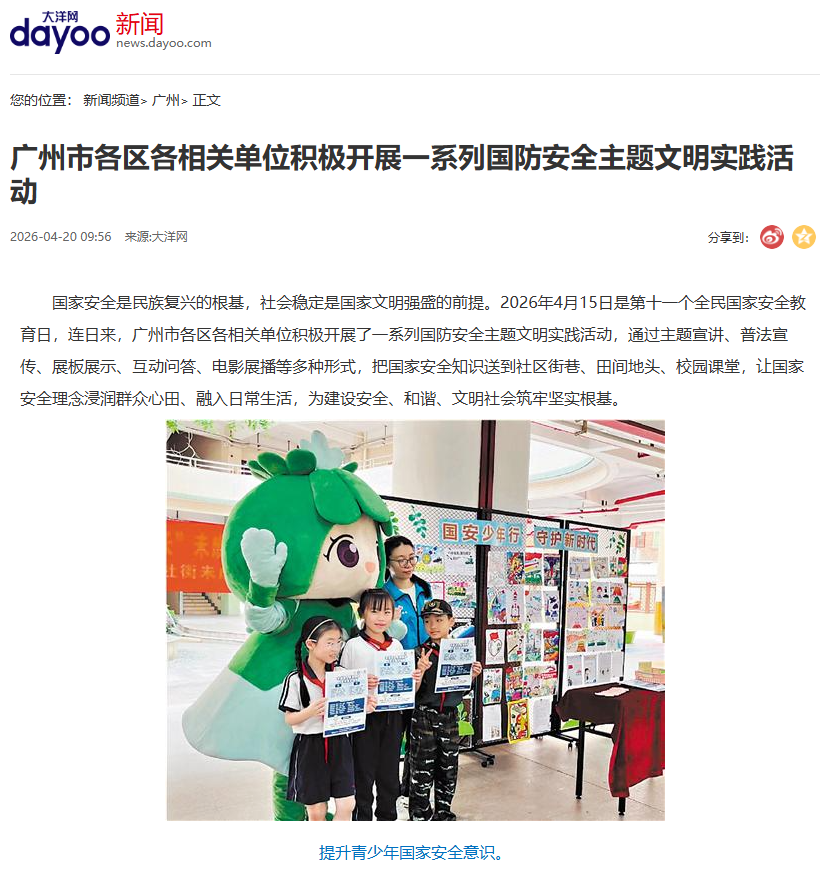 国家安全是民族复兴的根基,社会稳定是国家文明强盛的前提。2026年4月15日是第十一个全民国家安全教育日,连日来,广州市各区各相关单位积极开展了一系列国防安全主题文明实践活动,通过主题宣讲、普法宣传、展板展示、互动问答、电影展播等多种形式,把国家安全知识送到社区街巷、田间地头、校园课堂,让国家安全理念浸润群众心田、融入日常生活,为建设安全、和谐、文明社会筑牢坚实根基。
