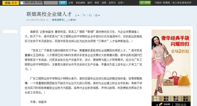 网易、搜狐网报道我院与诺华家具公司校外实训基地签约授牌仪式