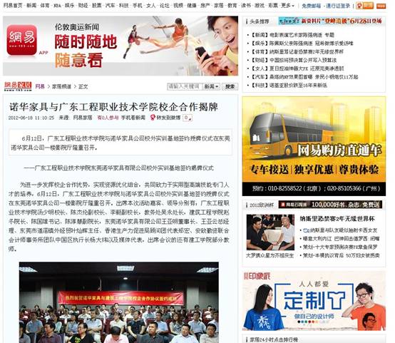 6月12日,广东工程职业技术学院与诺华家具公司校外实训基地签约授牌仪式在东莞诺华家具公司一楼影院厅隆重召开。该活动引起了各大媒体的高度关注,南方都市报、网易、搜狐网、东莞日报、东莞时间网等主流媒体争相作了相关报道,对我校的校企合作模式作出充分肯定。