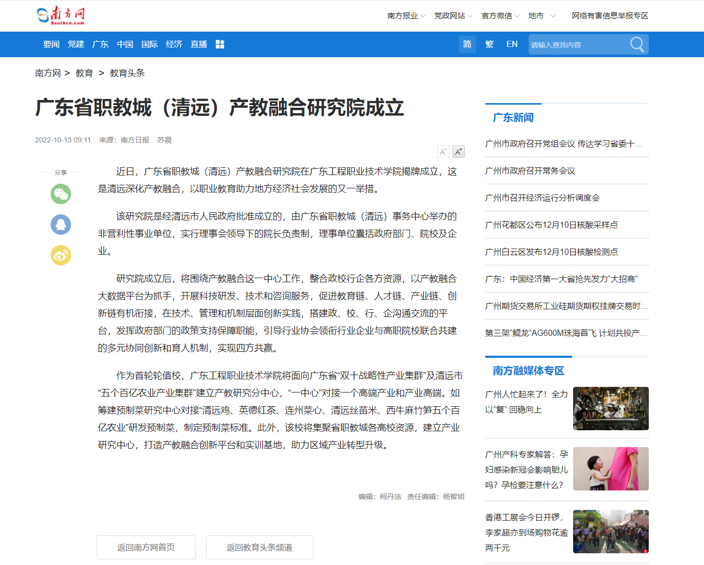 南方日报:广东省职教城(清远)产教融合研究院成立