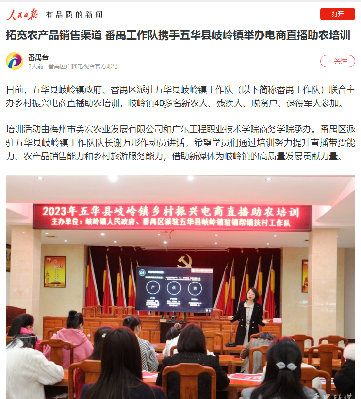 日前,五华县岐岭镇政府、番禺区派驻五华县岐岭镇工作队(以下简称番禺工作队)联合主办乡村振兴电商直播助农培训,岐岭镇40多名新农人、残疾人、脱贫户、退役军人参加。