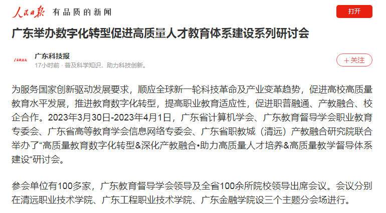 为服务国家创新驱动发展要求,顺应全球新一轮科技革命及产业变革趋势,促进高校高质量教育水平发展,推进教育数字化转型,提高职业教育适应性,促进职普融通、产教融合、校企合作。2023年3月30日-2023年4月1日,广东省计算机学会、广东教育督导学会职业教育专委会、广东省高等教育学会信息网络专委会、广东省职教城(清远)产教融合研究院联合举办了“高质量教育数字化转型&深化产教融合•助力高质量人才培养&高质量教学督导体系建设“研讨会。