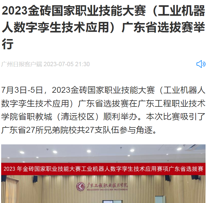 【广州日报】:2023金砖国家职业技能大赛(工业机器人数字孪生技术应用)广东省选拔赛举行