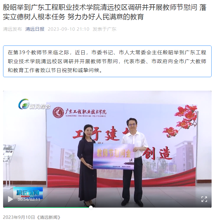 在第39个教师节来临之际,近日,市委书记、市人大常委会主任殷昭举到广东工程职业技术学院清远校区调研并开展教师节慰问,代表市委、市政府向全市广大教师和教育工作者致以节日祝贺和诚挚问候。