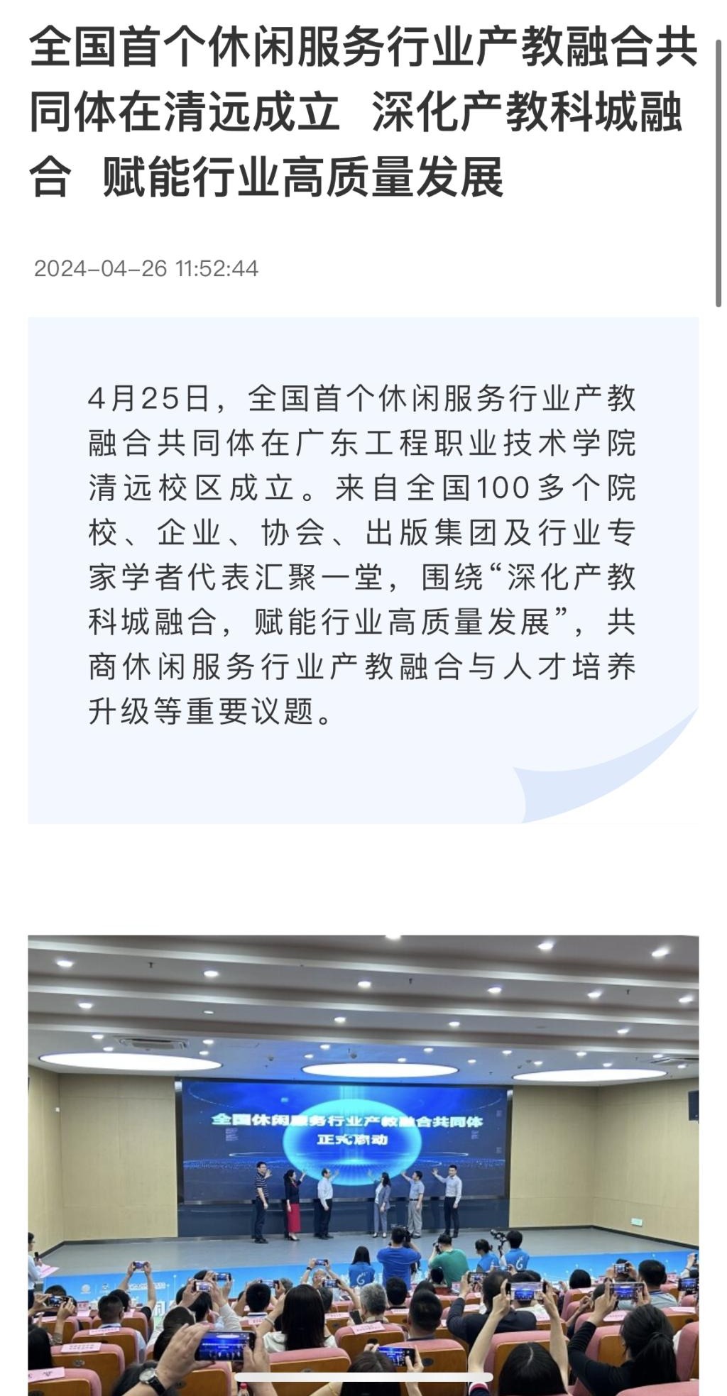 【清远日报】:全国首个休闲服务行业产教融合共同体在清远成立 深化产教科城融合 赋能行业高质量发展