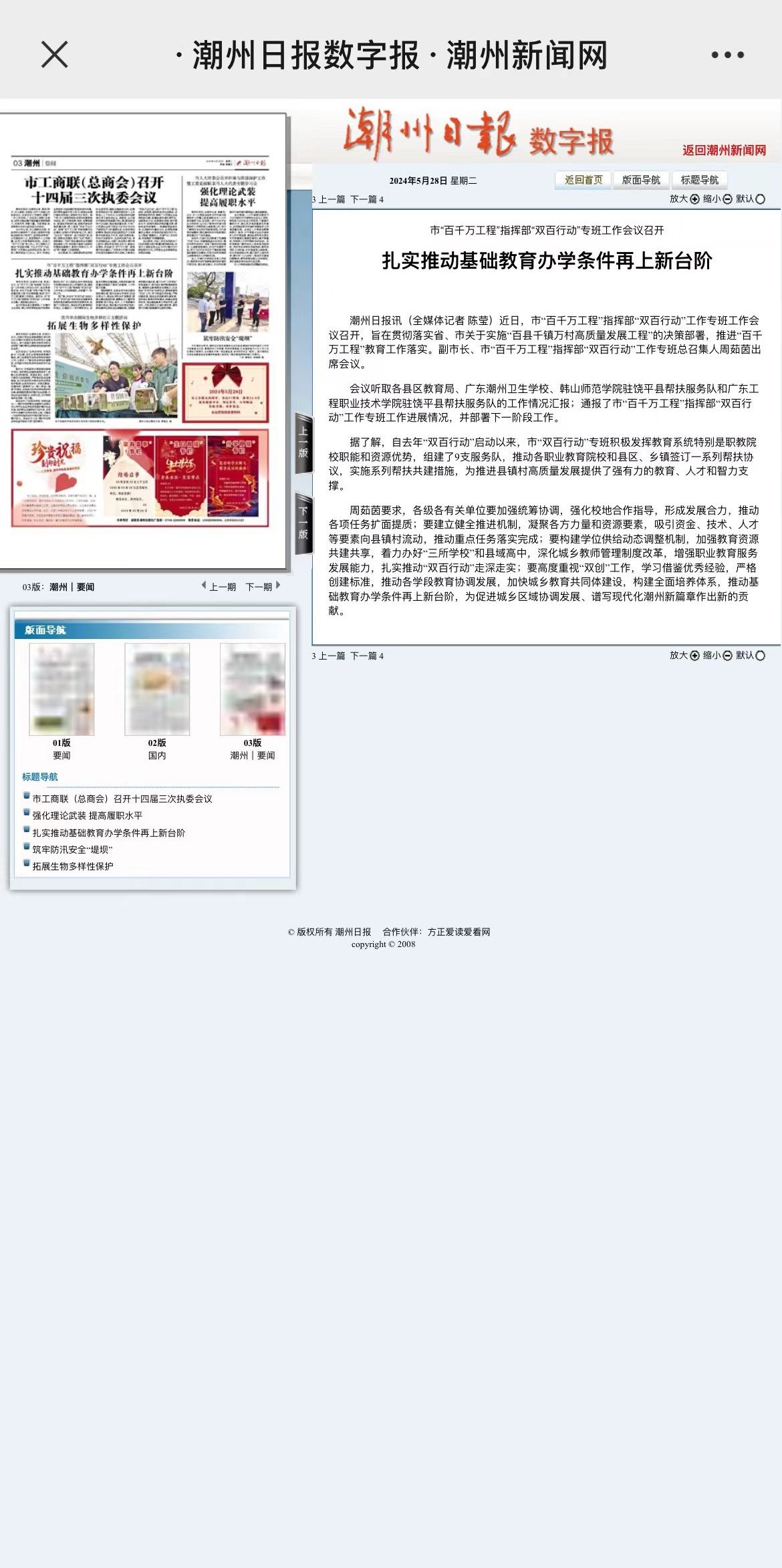 周茹茵要求,各级各有关单位要加强统筹协调,强化校地合作指导,形成发展合力,推动各项任务扩面提质;要建立健全推进机制,凝聚各方力量和资源要素,吸引资金、技术、人才等要素向县镇村流动,推动重点任务落实完成;要构建学位供给动态调整机制,加强教育资源共建共享,着力办好“三所学校”和县域高中,深化城乡教师管理制度改革,增强职业教育服务发展能力,扎实推动“双百行动”走深走实;要高度重视“双创”工作,学习借鉴优秀经验,严格创建标准,推动各学段教育协调发展,加快城乡教育共同体建设,构建全面培养体系,推动基础教育办学条件再上新台阶,为促进城乡区域协调发展、谱写现代化潮州新篇章作出新的贡献。