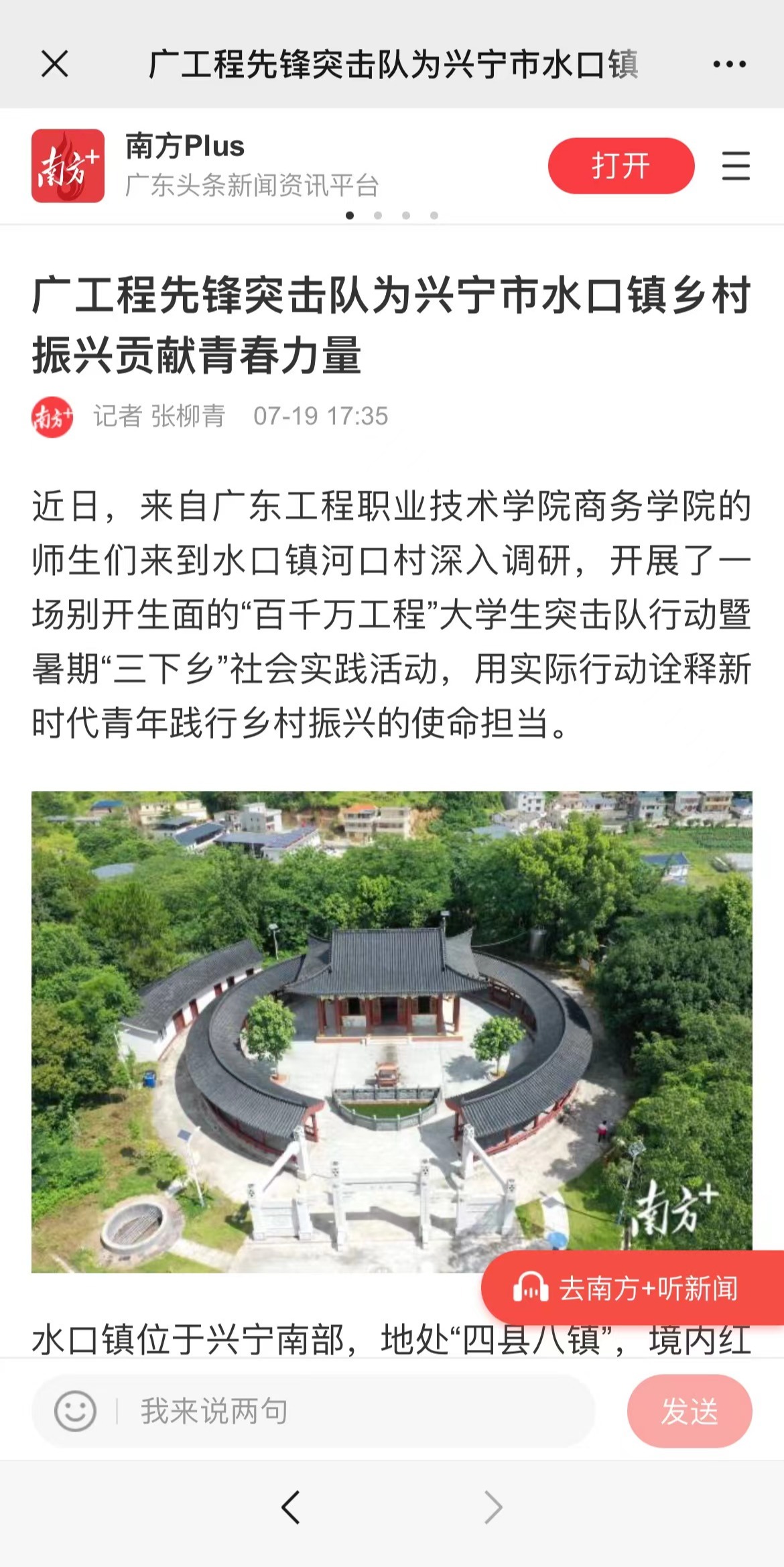聚焦河口村特色产业、乡村规划建设、文化传承和创新等领域,广东工程职业技术学院商务学院“广工程先锋突击队”与共青团水口镇委员会签订结对共建协议,校地合作迈上新台阶。