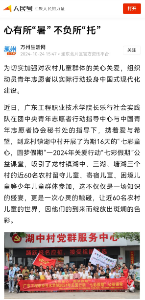 近日,广东工程职业技术学院长乐行社会实践队在团中央青年志愿者行动指导中心与中国青年志愿者协会秘书处的指导下,携着爱与希望,到龙村镇湖中村开展了为期16天的“七彩童心,圆梦假期”—2024年关爱行动“七彩假期”公益课堂,吸引了龙村镇湖中、三湖、塘湖三个村的近60名农村留守儿童、寄宿儿童、困境儿童等少年儿童群体参加,这不仅仅是一场知识的盛宴,更是一次心灵的触碰,让近60名农村儿童的世界,因他们的到来而绽放出斑斓的色彩。