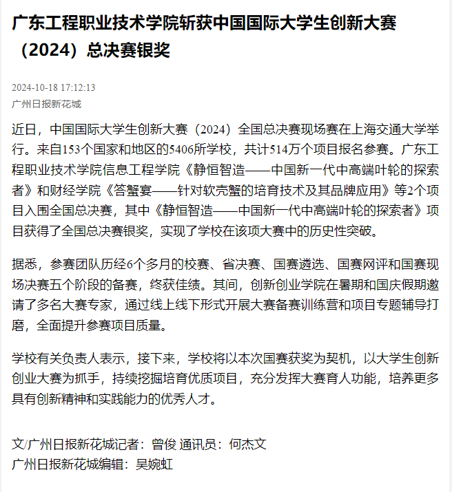 近日,中国国际大学生创新大赛(2024)全国总决赛现场赛在上海交通大学举行。来自153个国家和地区的5406所学校,共计514万个项目报名参赛。广东工程职业技术学院信息工程学院《静恒智造——中国新一代中高端叶轮的探索者》和财经学院《答蟹宴——针对软壳蟹的培育技术及其品牌应用》等2个项目入围全国总决赛,其中《静恒智造——中国新一代中高端叶轮的探索者》项目获得了全国总决赛银奖,实现了学校在该项大赛中的历史性突破。