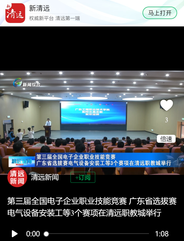【清远新闻】:第三届全国电子企业职业技能竞赛 广东省选拔赛电气设备安装工等3个赛项在清远职教城举行