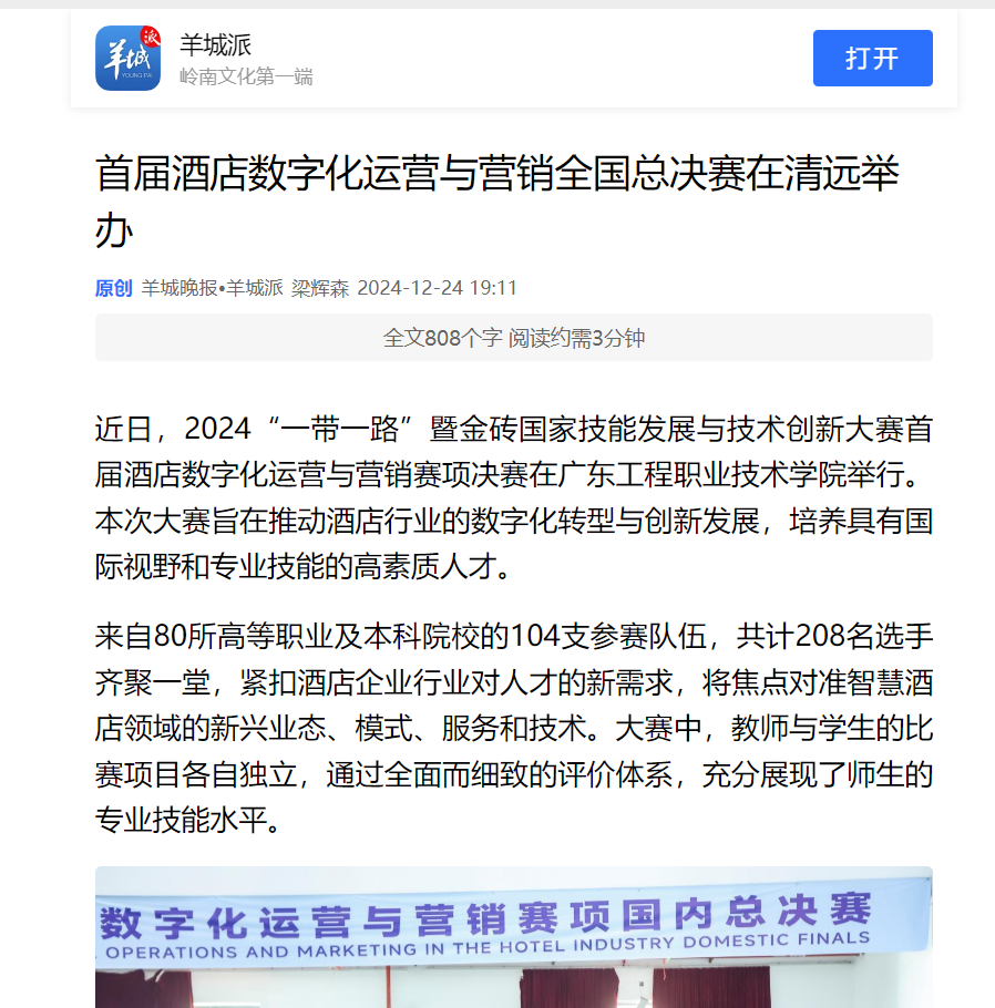 近日,2024“一带一路”暨金砖国家技能发展与技术创新大赛首届酒店数字化运营与营销赛项决赛在广东工程职业技术学院举行。本次大赛旨在推动酒店行业的数字化转型与创新发展,培养具有国际视野和专业技能的高素质人才。