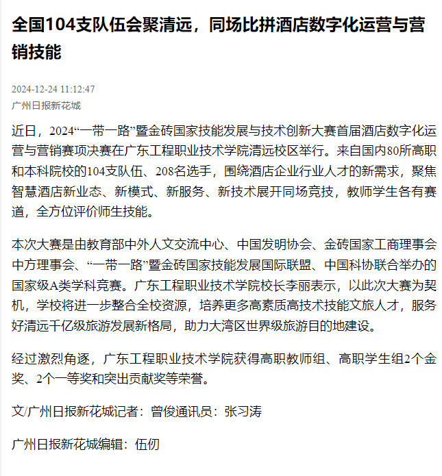 近日,2024“一带一路”暨金砖国家技能发展与技术创新大赛首届酒店数字化运营与营销赛项决赛在广东工程职业技术学院清远校区举行。来自国内80所高职和本科院校的104支队伍、208名选手,围绕酒店企业行业人才的新需求,聚焦智慧酒店新业态、新模式、新服务、新技术展开同场竞技,教师学生各有赛道,全方位评价师生技能。
