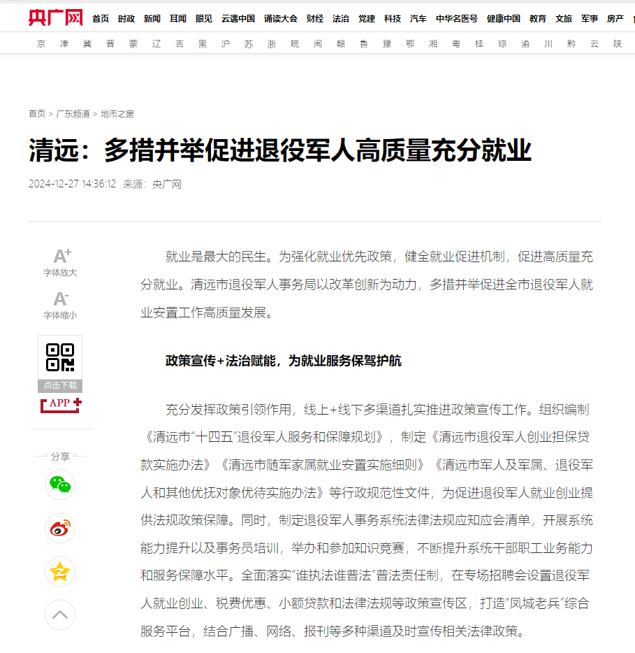 【央广网】:清远:多措并举促进退役军人高质量充分就业