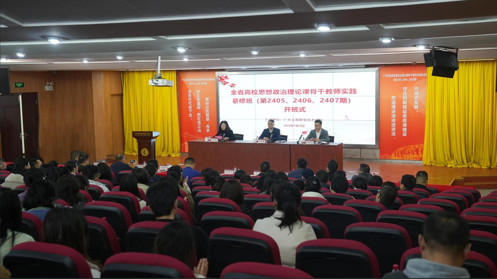为了引导广大思政课教师深入了解党和人民伟大的改革实践成果,从中汲取养分、丰富思想,培养一支政治要强、情怀要深、思维要新、视野要广、自律要严、人格要正的思政课教师队伍。广东省教育厅委托广东工程职业技术学院马克思主义学院承办全省高校思政课骨干教师实践研修班(2405、2406、2407期),于2025年1月10日在广东工程职业技术学院顺利开班。广东工程职业技术学院党委副书记方燕主持了开班式。