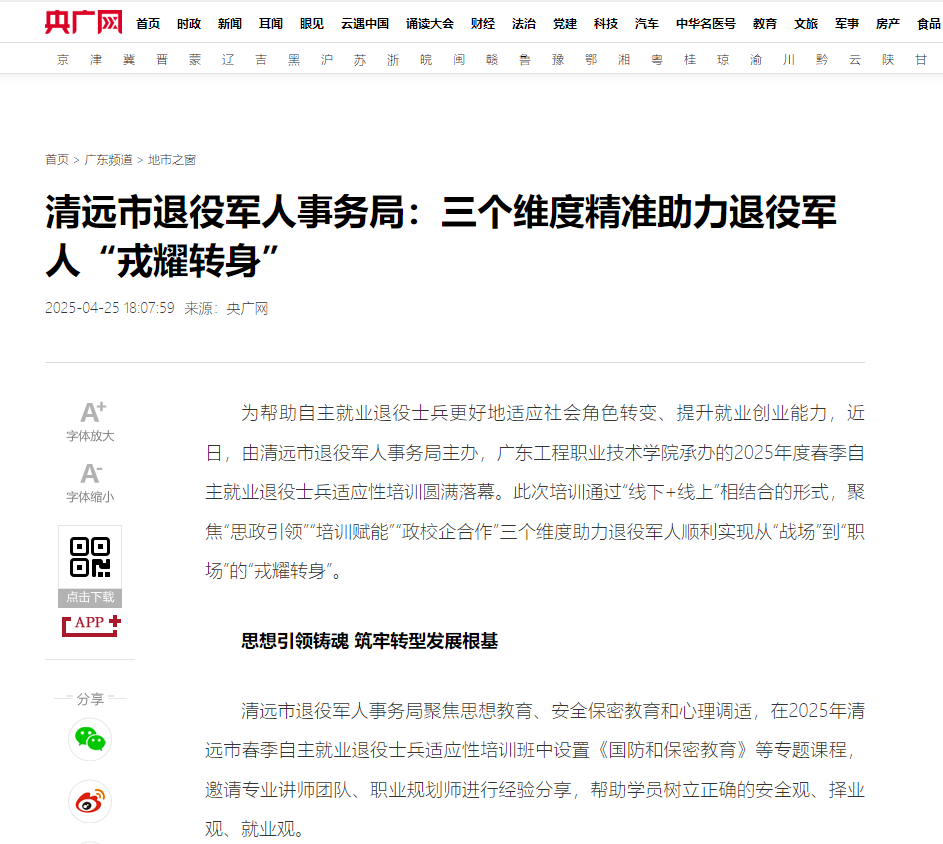 为帮助自主就业退役士兵更好地适应社会角色转变、提升就业创业能力,近日,由清远市退役军人事务局主办,广东工程职业技术学院承办的2025年度春季自主就业退役士兵适应性培训圆满落幕。此次培训通过“线下+线上”相结合的形式,聚焦“思政引领”“培训赋能”“政校企合作”三个维度助力退役军人顺利实现从“战场”到“职场”的“戎耀转身”。 思想引领铸魂 筑牢转型发展根基 清远市退役军人事务局聚焦思想教育、安全保密教育和心理调适,在2025年清远市春季自主就业退役士兵适应性培训班中设置《国防和保密教育》等专题课程,邀请专业讲师团队、职业规划师进行经验分享,帮助学员树立正确的安全观、择业观、就业观。