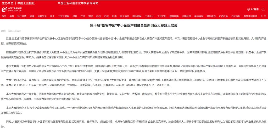 近日,由工业和信息化部网络安全产业发展中心(工业和信息化部信息中心)主办的第十届“创客中国”中小企业产教融合创新创业大赛在广州正式宣布启动。本次大赛旨在搭建中小企业与高校之间的产教融合桥梁,推动教育链、人才链与产业链、创新链的深度融合。