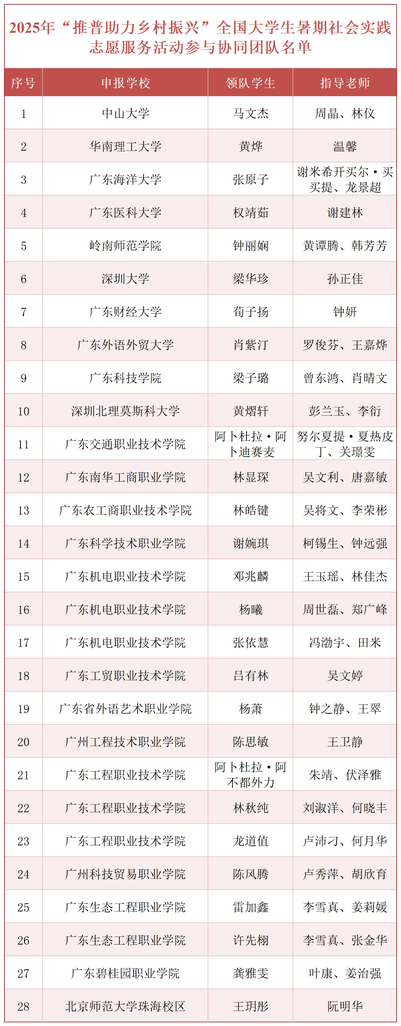 好消息!好消息!2025年“推普助力乡村振兴”全国大学生暑期社会实践志愿服务活动入选团队名单公布啦! 为深入贯彻落实党的二十大和二十届二中、三中全会精神,贯彻落实习近平总书记在全国教育大会上的重要讲话和关于语言文字的重要指示批示精神,落实《教育强国建设规划纲要(2024—2035年)》,加大国家通用语言文字推广力度,促进铸牢中华民族共同体意识,引导青年学生为中国式现代化贡献青春力量,教育部语言文字应用管理司、共青团中央青年发展部组织开展2025年“推普助力乡村振兴”全国大学生暑期社会实践志愿服务活动。 根据《关于开展2025年“推普助力乡村振兴”全国大学生暑期社会实践志愿服务活动的通知》相关要求,经委托相关国家语言文字推广基地组织专家审议,推荐北京大学等1000支团队入选重点团队、北京科技大学等1000支团队入选参与协同团队。