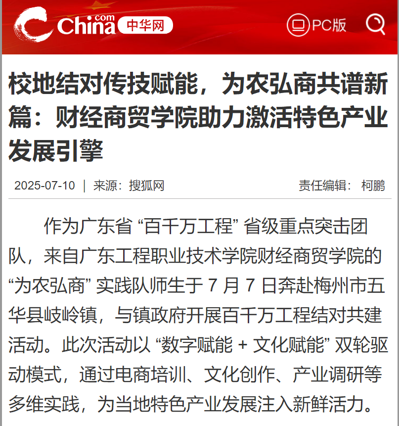 作为广东省 “百千万工程” 省级重点突击团队,来自广东工程职业技术学院财经商贸学院的“为农弘商” 实践队师生于 7 月 7 日奔赴梅州市五华县岐岭镇,与镇政府开展百千万工程结对共建活动。此次活动以 “数字赋能 + 文化赋能” 双轮驱动模式,通过电商培训、文化创作、产业调研等多维实践,为当地特色产业发展注入新鲜活力。