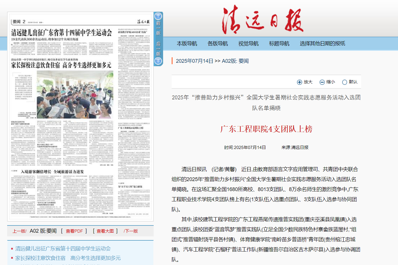 清远日报讯 (记者/黄馨) 近日,由教育部语言文字应用管理司、共青团中央联合组织的2025年“推普助力乡村振兴”全国大学生暑期社会实践志愿服务活动入选团队名单揭晓。在这场汇聚全国1680所高校、8013支团队、8万余名师生的激烈竞争中,广东工程职业技术学院4支团队榜上有名(1支队伍入选重点团队、3支队伍入选参与协同团队)。