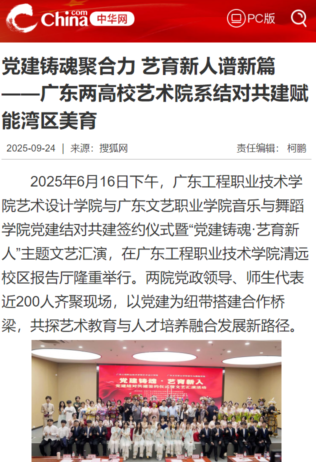 2025年9月24日《中华网》刊发文章《党建铸魂聚合力 艺育新人谱新篇——广东两高校艺术院系结对共建赋能湾区美育》,报道了我校艺术院系结对共建赋能湾区美育。