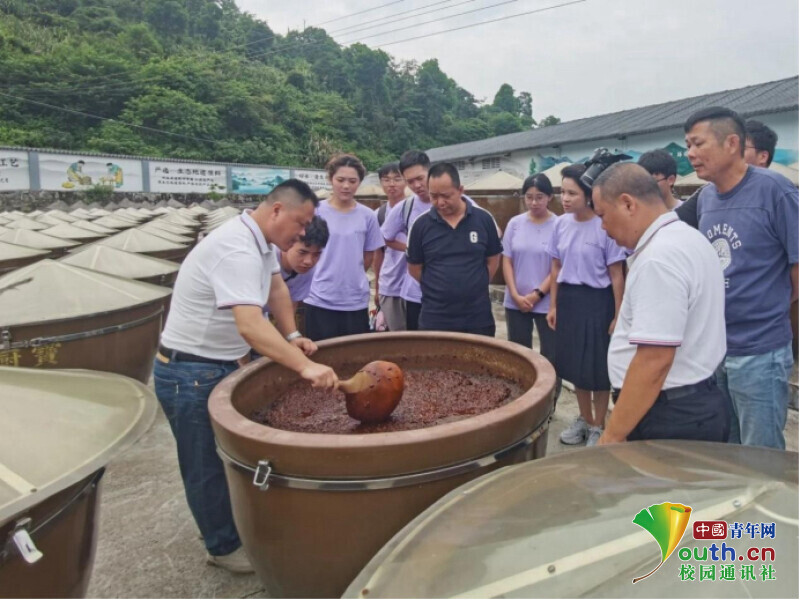 图为团队成员近距离观看并了解酱油的生产过程。邓梓炫 供图