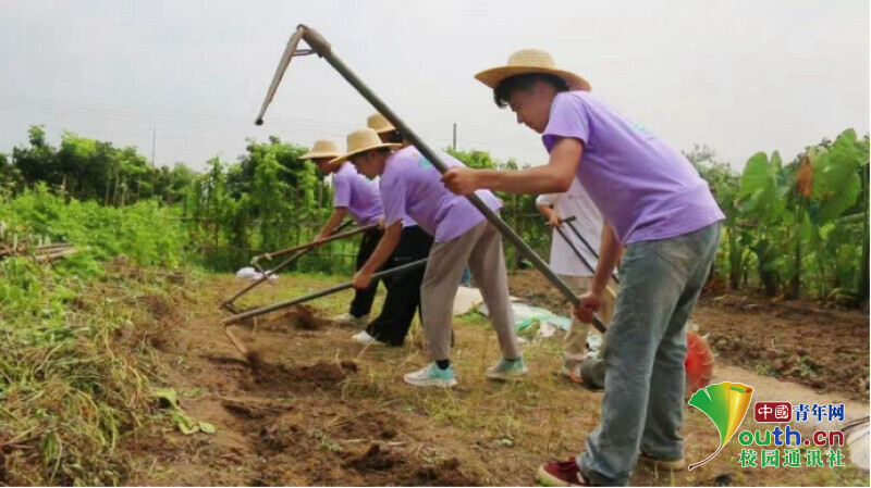 图为队员们执锄效仿农民,疏松土壤。李乐 供图
