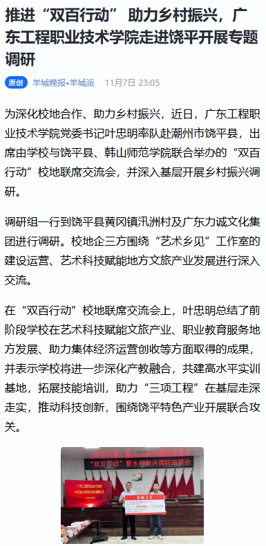 【羊城晚报】推进“双百行动” 助力乡村振兴,广东工程职业技术学院走进饶平开展专题调研
