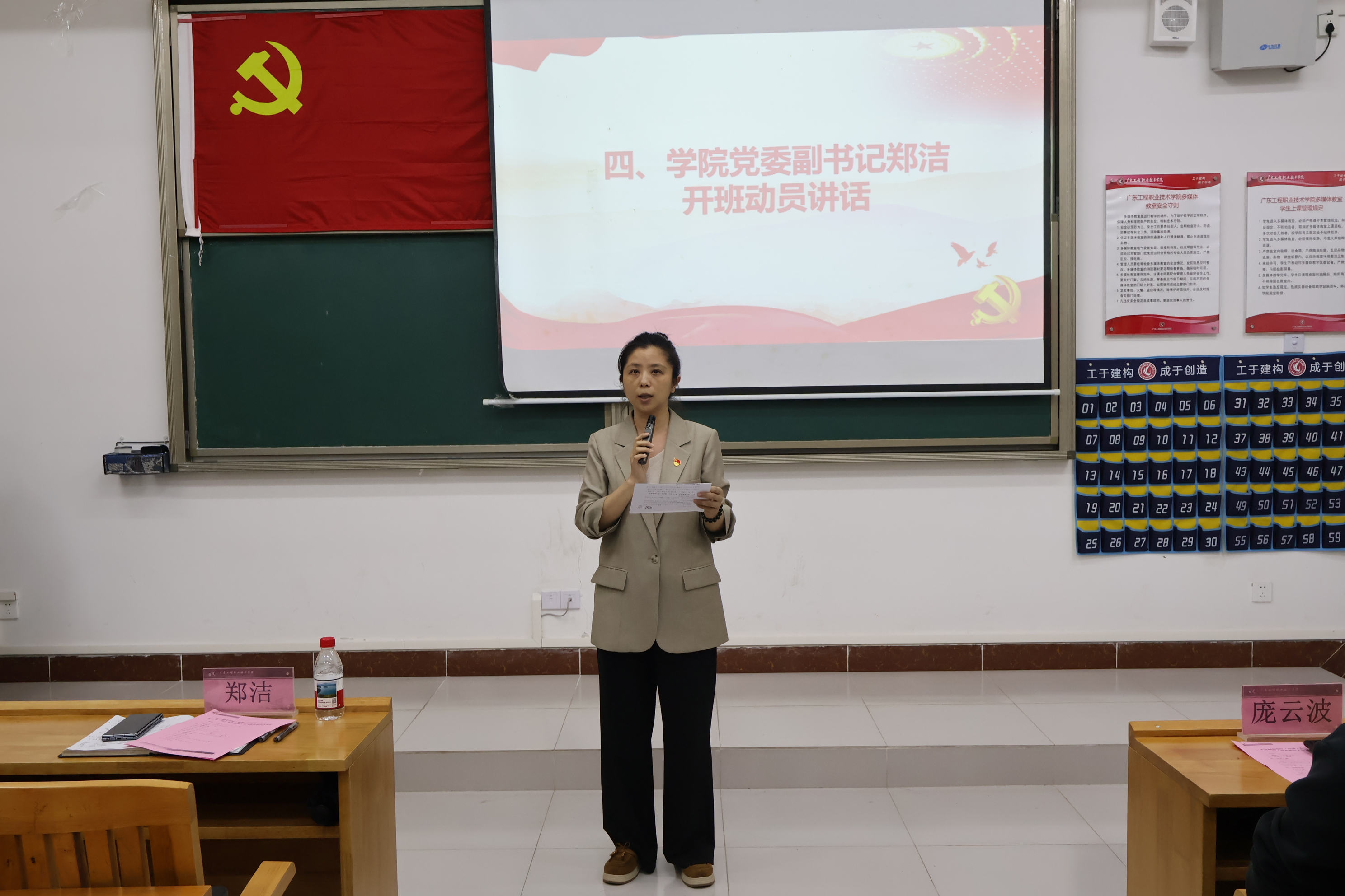 郑洁在开班动员讲话中代表学院党委对全体学员表示欢迎与祝贺。她指出,作为先进制造学院的学子,身处伟大时代,学员们要深入领会党的二十届四中全会精神,把握高质量发展与新质生产力对制造业的要求,努力成长为高素质技术技能人才,助力制造强国建设。她对全体学员提出三点期望:一是坚定理想信念,把“听党话、跟党走”作为青春航向;二是弘扬工匠精神,把“实干兴邦、技能报国”作为价值追求;三是注重知行合一,把“志愿服务、全面发展”作为成长底色,在奉献中锤炼党性。她勉励大家端正入党动机,树立全心全意为人民服务的宗旨,为实现社会主义现代化强国目标不懈奋斗。