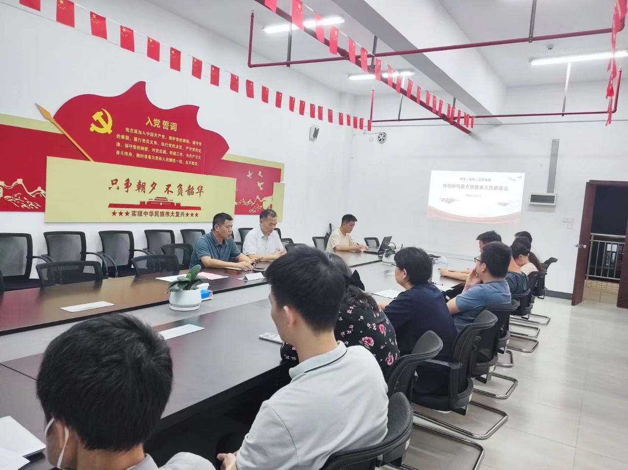 6月3日21时,为加强我院师德师风建设,大力推动我院就业工作进程,根据学校省域双高校的建设任务要求,以及学校《关于加强二级学院(部)师德师风体制机制建设的意见》的文件精神,机电(电梯)工程学院通过“线上+线下”形式在清远校区Q2-203室召开师德师风教育暨就业工作推进会,学院党委书记周奇舟、院长曹立生出席会议,全院教师参加会议。