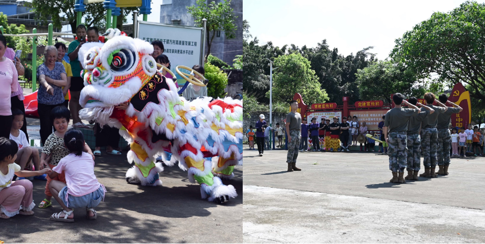 工程学子还给村民和孩子们带来了精彩的文艺表演,退役士兵团队《铁血军魂》表演展现了当代青年的英勇、血性与担当,挥拳刚劲有力、眼神坚毅锐利;王凯庆同学饱含激情讲述了服役期间我和老班长的故事;伴随雄浑的鼓声响起,一文一武两只舞狮跃然登场,活灵活现、栩栩如生,精彩的舞狮表演更是将现场气氛推向了高潮,为整个出征仪式增添了浓厚的喜庆色彩。活动最后,周奇舟书记与欧志鹏组长贴心的为小朋友派发了学习礼包。