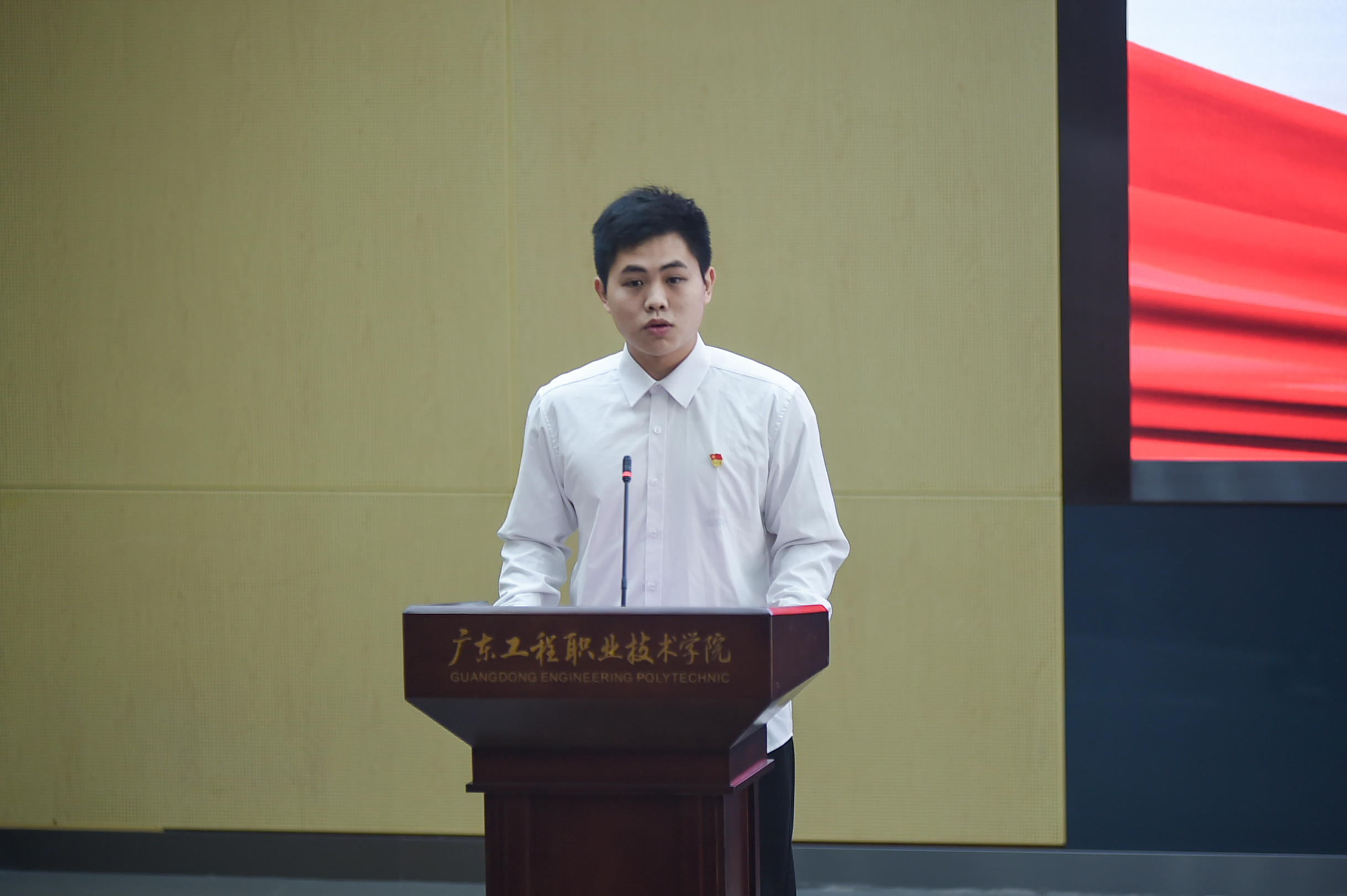 获奖代表2022级机电一体化技术B班陈虞威同学分享了班级管理的宝贵经验和自身的学习经验和参赛经验,呼吁同学们以此次表彰为新起点,积极参与活动提升自我,鼓励全体同学不断挑战,勇攀高峰,用奋斗点缀青春,用行动创造佳绩。