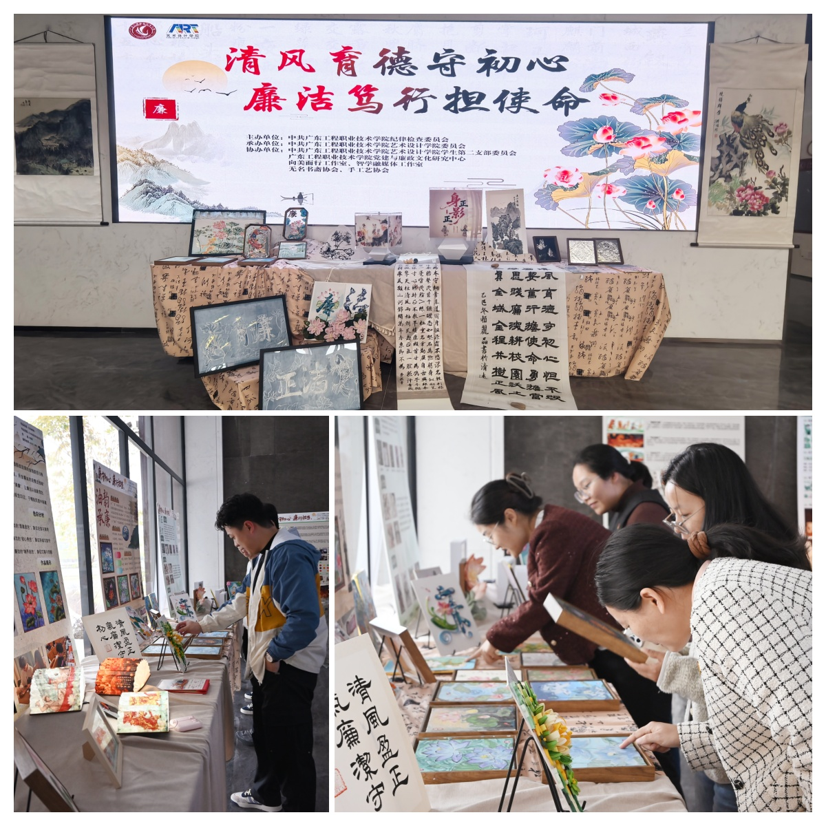 本次展览会展出的作品形式多样,内涵深刻。创作师生运用衍纸、掐丝珐琅、剪纸、纸雕、油画等丰富媒介,将廉洁文化的深刻内涵转化为可感、可触、可思的视觉语言与沉浸体验,创作出了“清正廉明”“克己奉公”等一系列主题鲜明的艺术作品。特别是融合皮影智慧的“身正影正”灯艺、融入醒狮、龙舟等岭南元素的创作作品,生动诠释了廉洁文化的传统底蕴与时代价值。现场设置的微视频展播、手工艺体验与故事宣讲区三大互动体验区,更是增强了教育的互动性与感染力。