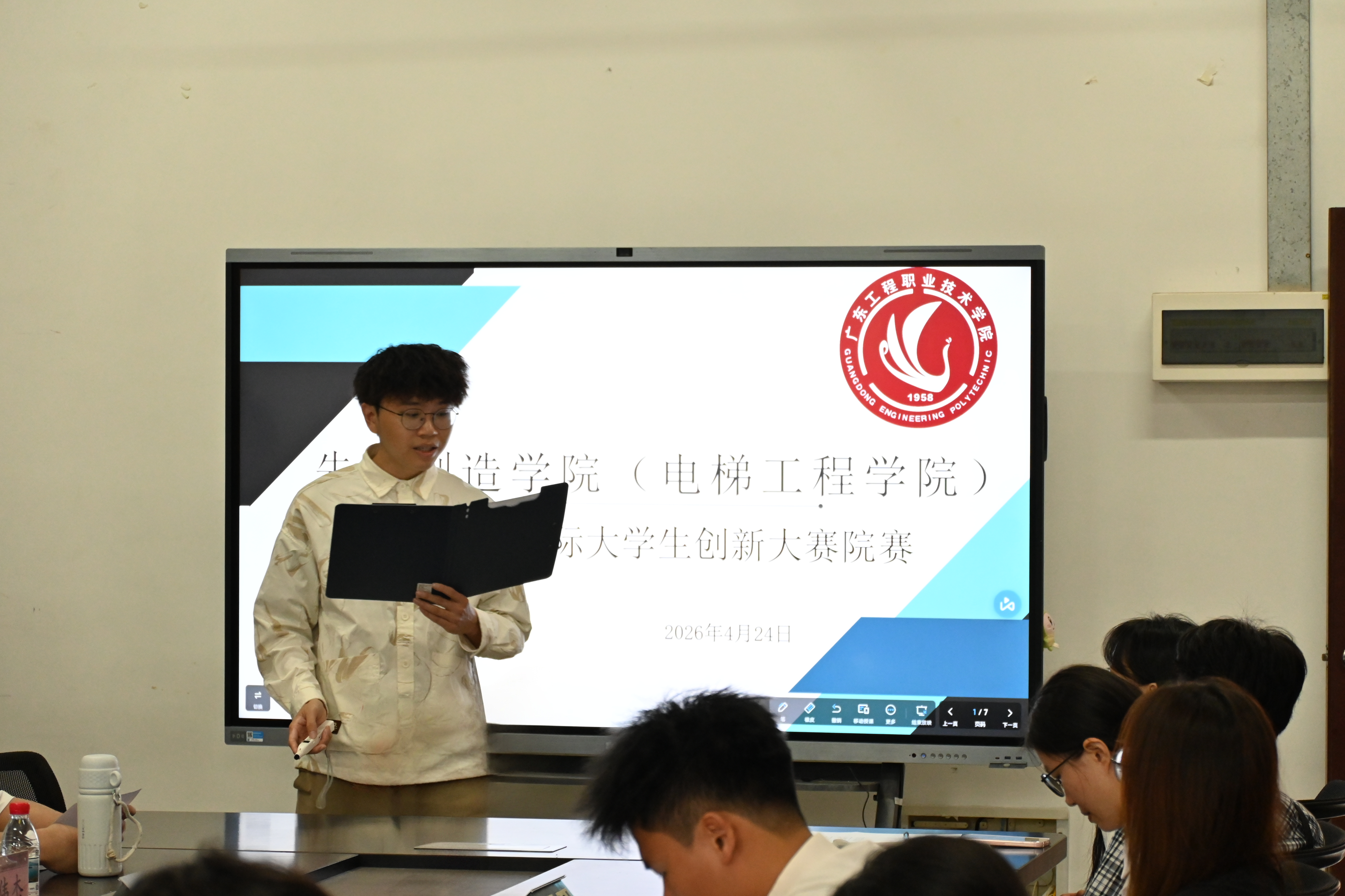 4月24日,中国国际大学生创新大赛(2026)先进制造学院(电梯工程学院)院级选拔赛在Q2-203举行。学院党委副书记郑洁、副院长莫康信,创新创业学院温豪老师,以及学院潘力、王耀聪、郭伟杰老师出席。共有8支项目团队参与路演。