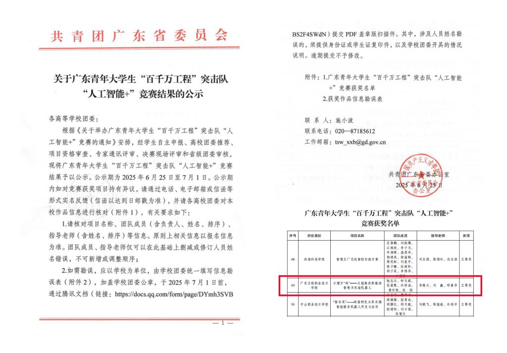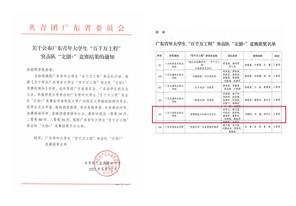 在广东省全面推进“百县千镇万村高质量发展工程”的关键阶段,先进制造学院(电梯工程学院)再创佳绩!6月19日,我院在由团省委、省学联主办的广东青年大学生“百千万工程”突击队行动系列竞赛中,荣获“文创+”“人工智能+”竞赛两项三等奖。