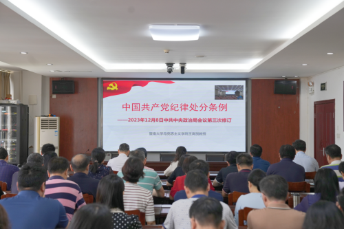 王高贺教授以“新修订《中国共产党纪律处分条例》解读”为主题,从《中国共产党纪律处分条例》修订背景与意义、修订过程和特点、新旧版本条例对比分析等方面进行了系统解读和深入阐释。他结合“六大纪律”的主旨要义和规定要求,重点围绕与党员干部师生密切相关的纪律规定,对《条例》新增或修改部分的主要内容、关键条款进行了详实解读,引导全校党员干部搞清楚党的纪律规矩是什么,弄明白能干什么、不能干什么,进一步强化纪律意识、提高党性修养。整场主题鲜明、逻辑严谨、内容丰富、案例详实,既有理论高度,又有很强的实践指导性,为进一步扎实开展党纪学习教育起到了很好的推动作用。