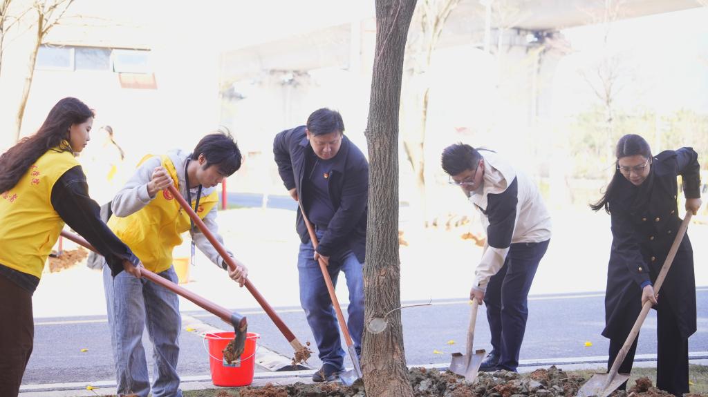 叶忠明书记强调,植树造林是功在当代、利在千秋的事业,我们以实际行动践行绿色发展理念,更要厚植家国情怀,将生态保护融入使命担当。在他带领下,师生们挥锹铲土、扶苗定根、培土围堰、提水浇灌……动作娴熟,每一道工序都一丝不苟,积极投入植树活动当中。铁锹破土的沉闷声响、水桶碰撞的清脆声、传来的爽朗笑声,交织成春日里最动听的劳动交响曲。新种植的树木在春风中轻轻摇曳,为校园平添勃勃生机。