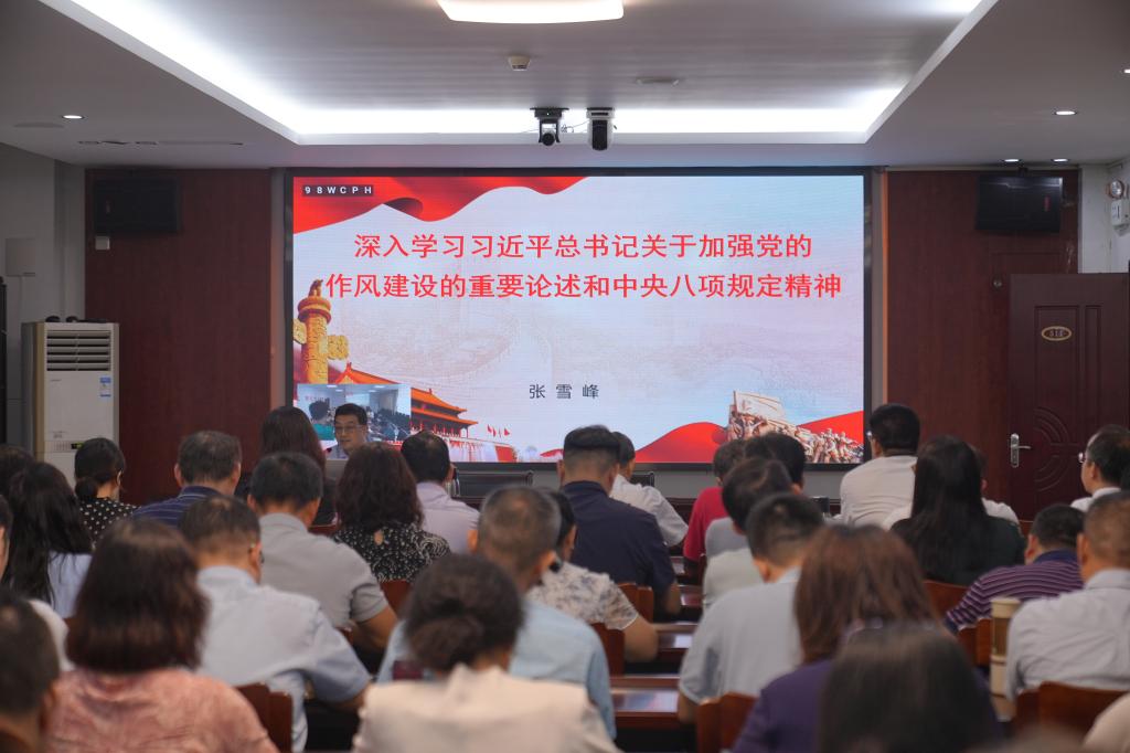 “中央八项规定自出台后,带来的党风政风社风民风变化,深刻影响和改变着中国。”张雪峰教授以《深入学习习近平总书记关于加强党的作风建设的重要论述和中央八项规定精神》为题,从“新时代加强党的作风建设的重要性和必要性”“中央八项规定是改进作风的切入口和动员令”“把深入贯彻中央八项规定精神学习教育做深做实”三个方面与大家深入学习习近平总书记关于加强党的作风建设的重要论述和中央八项规定及其实施细则精神,通过违反中央八项规定精神的典型案例剖析,深刻阐述了在全党开展深入贯彻中央八项规定精神学习教育的重要意义,从学有质量、查有力度、改有成效、开门教育等方面分析了如何做深做实深入贯彻中央八项规定精神学习教育。整场报告主题鲜明、逻辑严谨、内容丰富,既有理论的高度,又有很强的实践指导性,为我们进一步推进深入贯彻中央八项规定精神学习教育起到了很好的推动作用。