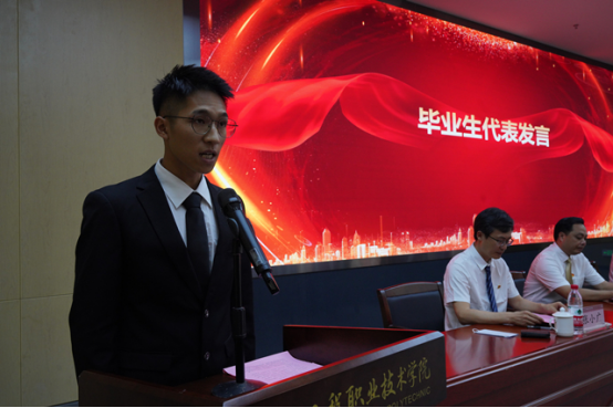 机电(电梯)工程学院李兆基同学作为毕业生代表发言,他分享了成长的喜悦,表达了对学校的辛勤培养和师长关心爱护的感激之情。
