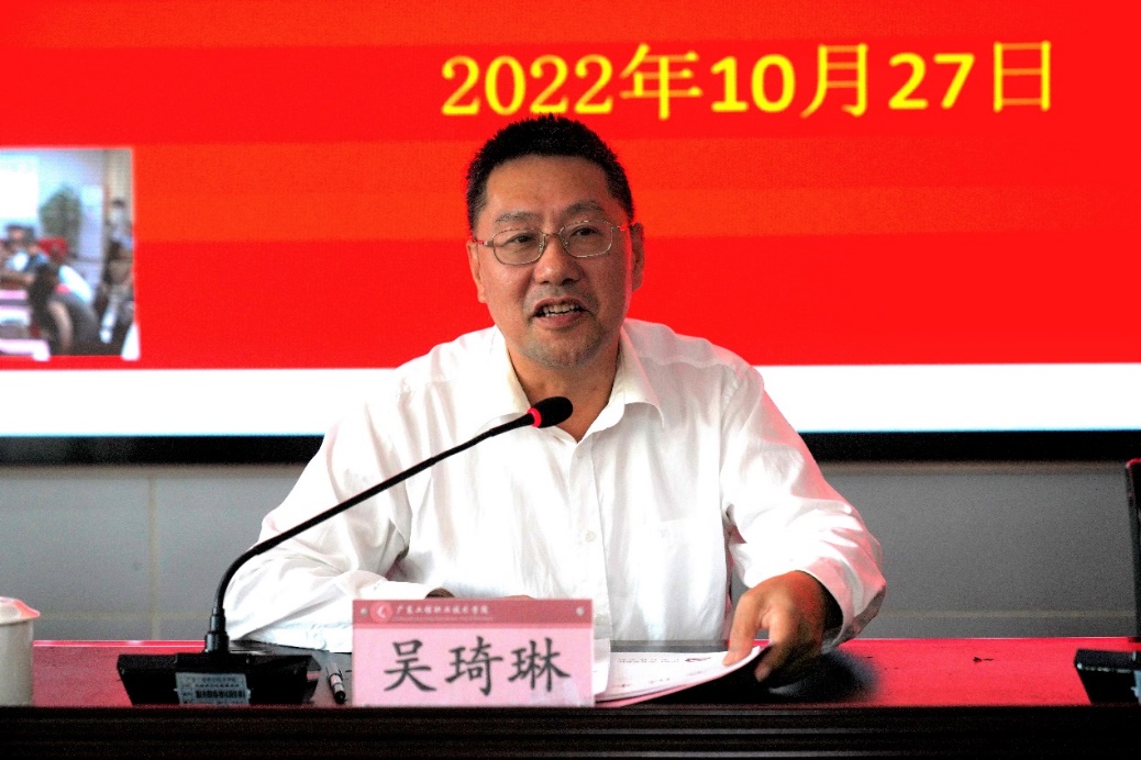 最后,学校党委书记吴琦琳作总结讲话,强调我们要认识到省域高水平高等职业院校建设是学校的又一重大历史机遇,是学校当前和今后一个时期最重要、最紧迫的任务。全体师生员工要锚定目标,脚踏实地,奋发有为,将思想认识和行动统一到学校省域高水平高职院校建设任务上来,凝心聚力,全力推动建设任务落地,推动学校事业高质量发展。并提出两点工作意见。一是要强化责任担当,全力做好建设工作。将思想和行动统一到省域高水平高职院校建设任务上来,强化责任担当,切实增强创建“双高”校的责任感和紧迫感。二是要立足学校实际,全面落实建设任务。省域高水平高等职业院校是一项系统性工程,时间紧,任务重,项目多,投入大。既要高质量完成建设任务,把学校建设好发展好,又要实现好、维护好、发展好广大教职工的根本利益,使广大教职工充分享受学校改革发展成果,切实提高教职工的获得感、幸福感。