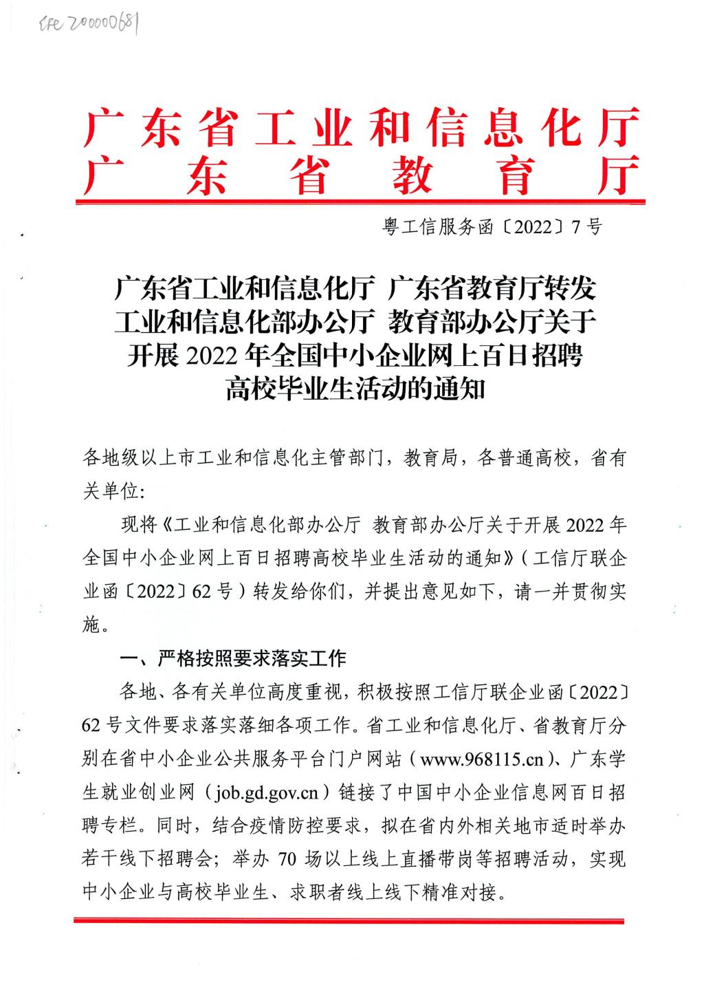 现将《工业和信息化部办公厅 教育部办公厅关于开展2022年全国中小企业网上百日招聘高校毕业生活动的通知》(工信厅联企业函[2022]62号)转发给你们,并提出意见如下,请一并贯彻实施。