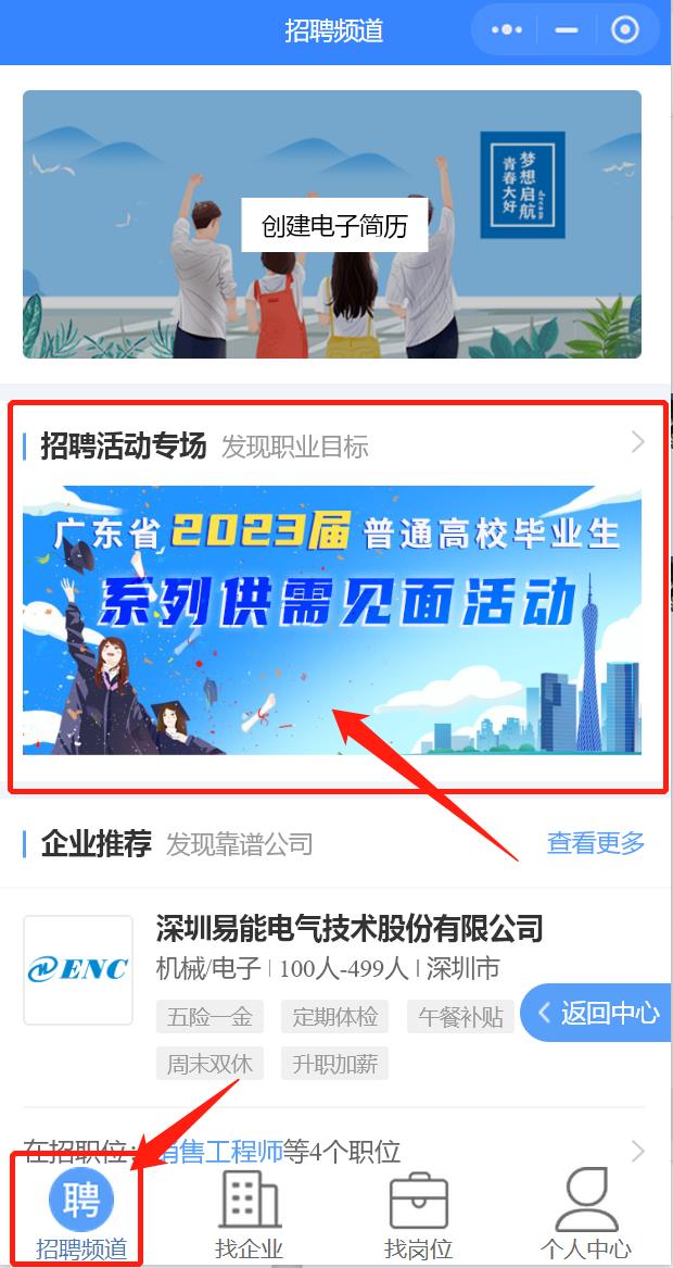 4、点击招聘频道进入招聘活动专场报名