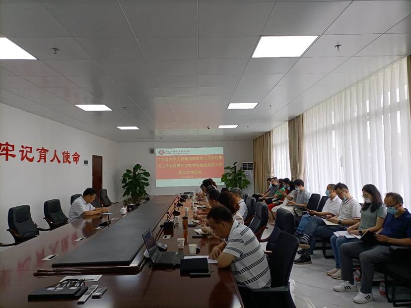 2022年4月27日上午,我校在广州校区办公楼615室和省职教城校区办公楼411室连线同步召开广东省大学生创新创业教育示范学校复评工作会议暨2022年学校就业创业工作第二次推进会。学校党委书记吴琦琳、校长李丽、副校长张小广,党政办公室、人事处、教务处、财务处、科技处、校团委负责人,各二级学院院长、党总支书记、副院长、党总支副书记、2022届毕业班就业创业工作辅导员以及创业学院全体人员参加了会议。会议由副校长张小广主持。